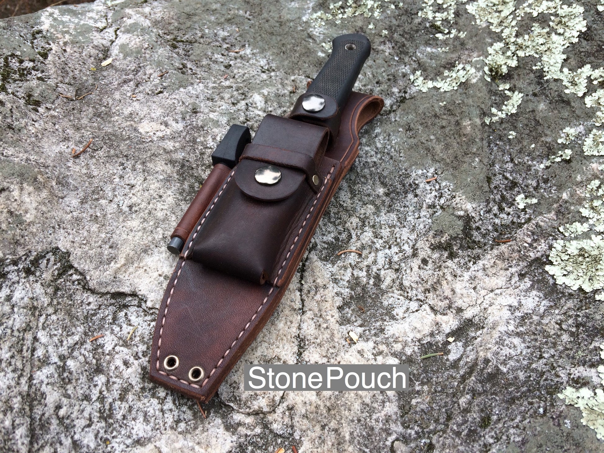 Fit's 5/16 Ferro rod , stone pouch fits a DC4 sharpening stone or other choices for tinder .